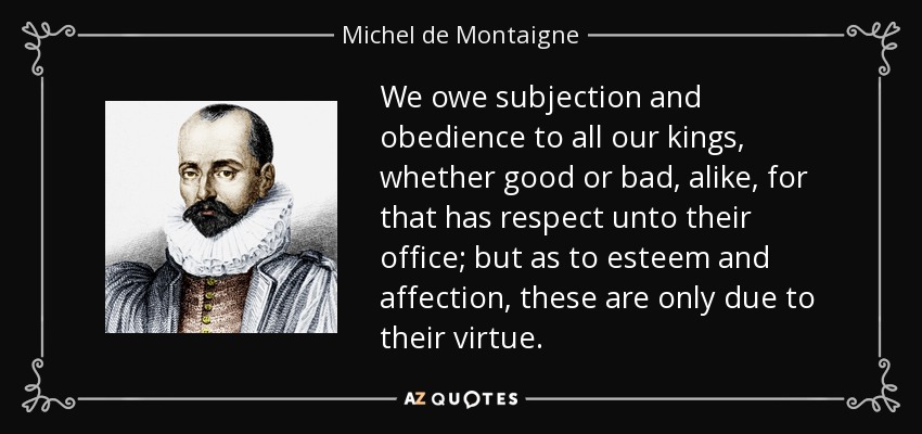 We owe subjection and obedience to all our kings, whether good or bad, alike, for that has respect unto their office; but as to esteem and affection, these are only due to their virtue.