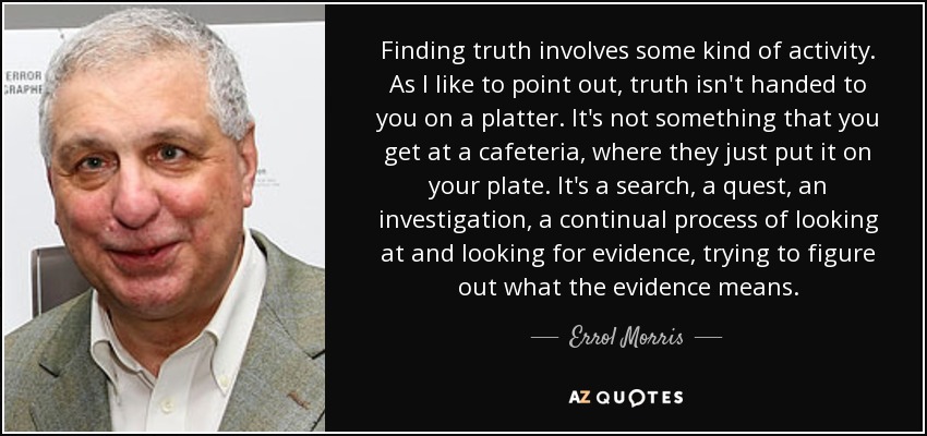 Finding truth involves some kind of activity. As I like to point out, truth isn't handed to you on a platter. It's not something that you get at a cafeteria, where they just put it on your plate. It's a search, a quest, an investigation, a continual process of looking at and looking for evidence, trying to figure out what the evidence means.