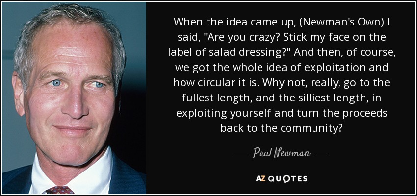 When the idea came up, (Newman's Own) I said, "Are you crazy? Stick my face on the label of salad dressing?" And then, of course, we got the whole idea of exploitation and how circular it is. Why not, really, go to the fullest length, and the silliest length, in exploiting yourself and turn the proceeds back to the community?