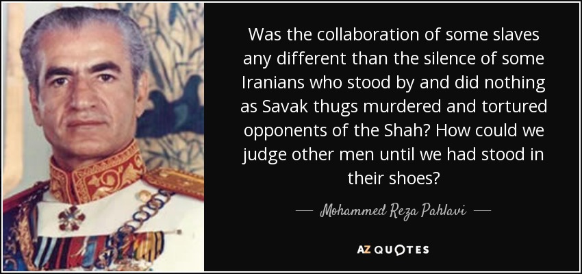 Was the collaboration of some slaves any different than the silence of some Iranians who stood by and did nothing as Savak thugs murdered and tortured opponents of the Shah? How could we judge other men until we had stood in their shoes?