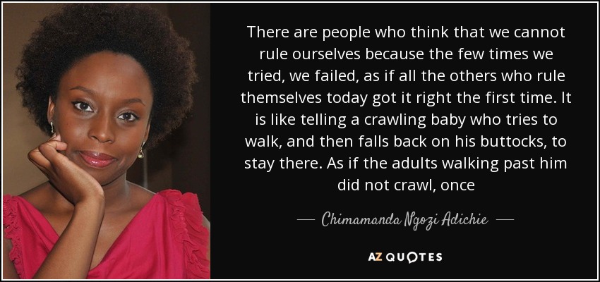 There are people who think that we cannot rule ourselves because the few times we tried, we failed, as if all the others who rule themselves today got it right the first time. It is like telling a crawling baby who tries to walk, and then falls back on his buttocks, to stay there. As if the adults walking past him did not crawl, once