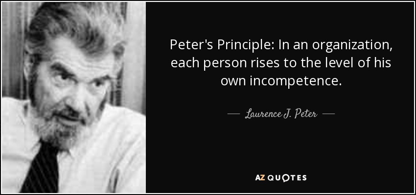 The Peter Principle ch. 1 (1969). An earlier version by Peter was reported in the Wall Street Journal, 8 June 1967: "The Peter Principle is this: In each hierarchy, whether it be government, business, etc., each employee tends to rise to his level of incompetence. Every post tends to be occupied by an employee incompetent to execute its duties... . Dr. Peter explains that the work is done by people who have not yet attained final placement at their level of incompetence." See Scott Adams 1