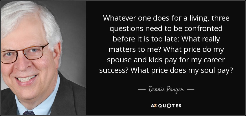 Whatever one does for a living, three questions need to be confronted before it is too late: What really matters to me? What price do my spouse and kids pay for my career success? What price does my soul pay?