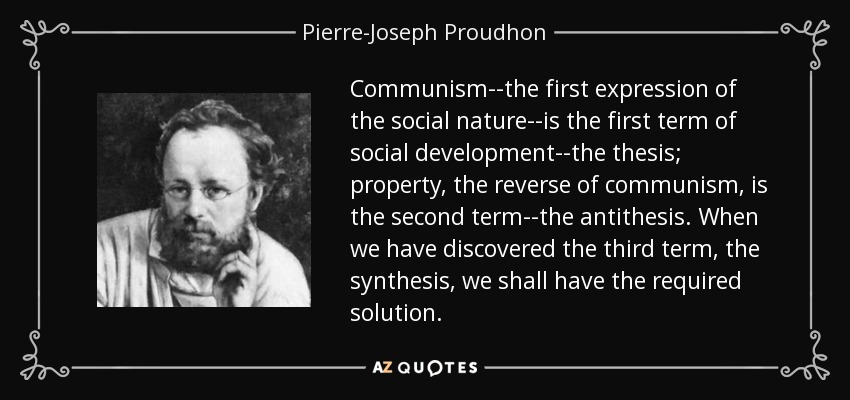 Communism--the first expression of the social nature--is the first term of social development--the thesis; property, the reverse of communism, is the second term--the antithesis. When we have discovered the third term, the synthesis, we shall have the required solution.