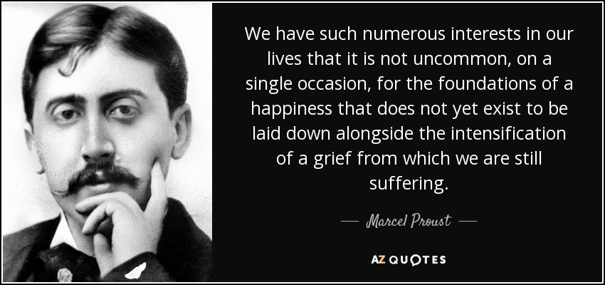 We have such numerous interests in our lives that it is not uncommon, on a single occasion, for the foundations of a happiness that does not yet exist to be laid down alongside the intensification of a grief from which we are still suffering.