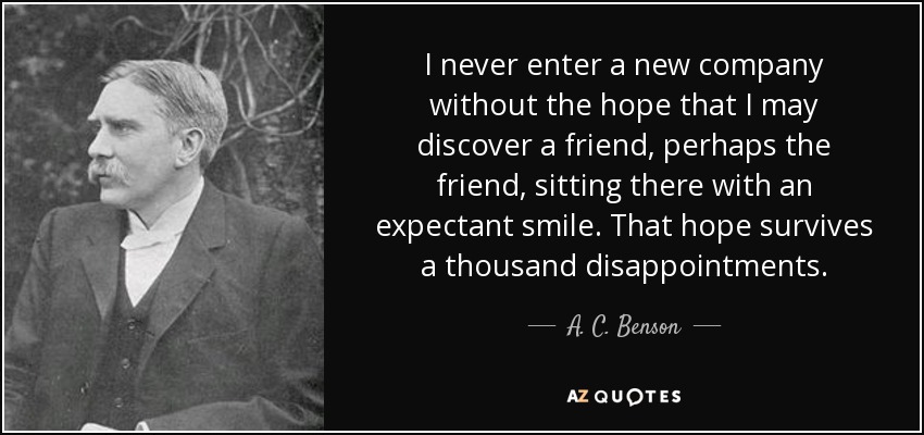 I never enter a new company without the hope that I may discover a friend, perhaps the friend, sitting there with an expectant smile. That hope survives a thousand disappointments.
