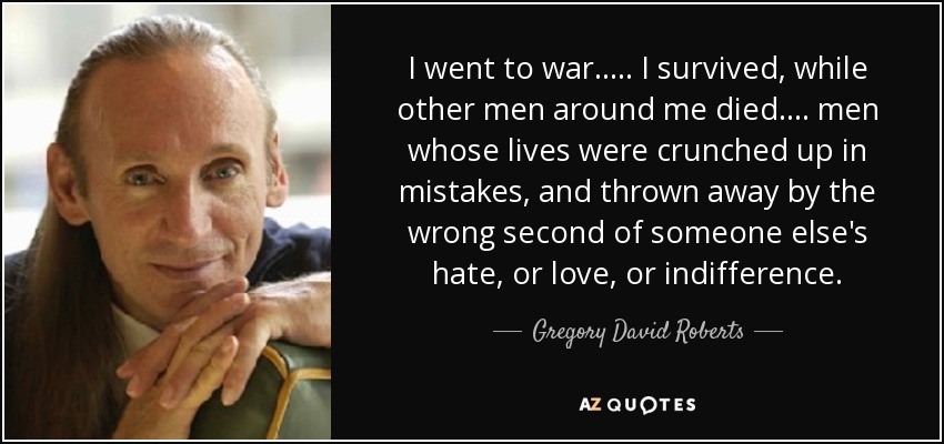 I went to war. .... I survived, while other men around me died. ... men whose lives were crunched up in mistakes, and thrown away by the wrong second of someone else's hate, or love, or indifference.