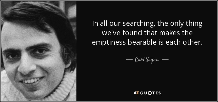 Our planet is a lonely speck in the great enveloping cosmic dark. In our obscurity, in all this vastness, there is no hint that help will come from elsewhere to save us from ourselves.