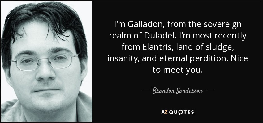 I'm Galladon, from the sovereign realm of Duladel. I'm most recently from Elantris, land of sludge, insanity, and eternal perdition. Nice to meet you.