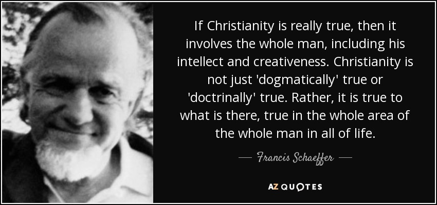 If Christianity is really true, then it involves the whole man, including his intellect and creativeness. Christianity is not just 'dogmatically' true or 'doctrinally' true. Rather, it is true to what is there, true in the whole area of the whole man in all of life.