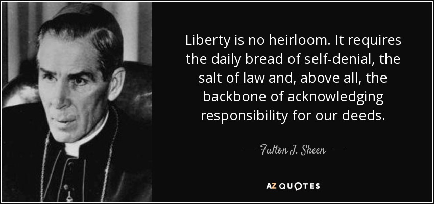 Liberty is no heirloom. It requires the daily bread of self-denial, the salt of law and, above all, the backbone of acknowledging responsibility for our deeds.