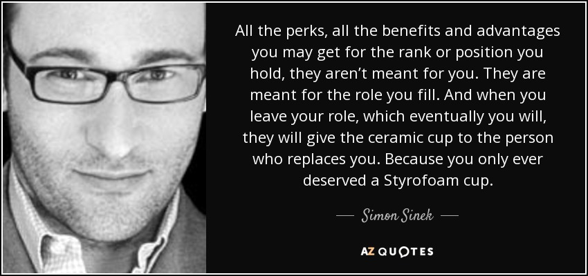 All the perks, all the benefits and advantages you may get for the rank or position you hold, they aren’t meant for you. They are meant for the role you fill. And when you leave your role, which eventually you will, they will give the ceramic cup to the person who replaces you. Because you only ever deserved a Styrofoam cup.