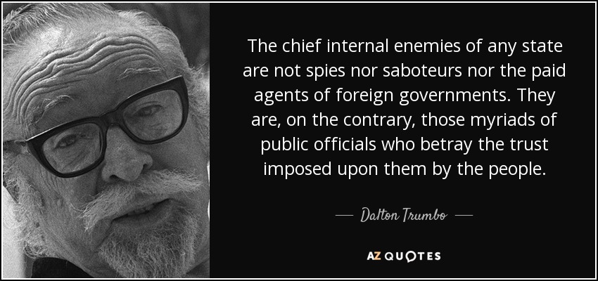 The chief internal enemies of any state are not spies nor saboteurs nor the paid agents of foreign governments. They are, on the contrary, those myriads of public officials who betray the trust imposed upon them by the people.