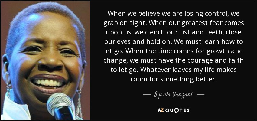 When we believe we are losing control, we grab on tight. When our greatest fear comes upon us, we clench our fist and teeth, close our eyes and hold on. We must learn how to let go. When the time comes for growth and change, we must have the courage and faith to let go. Whatever leaves my life makes room for something better.