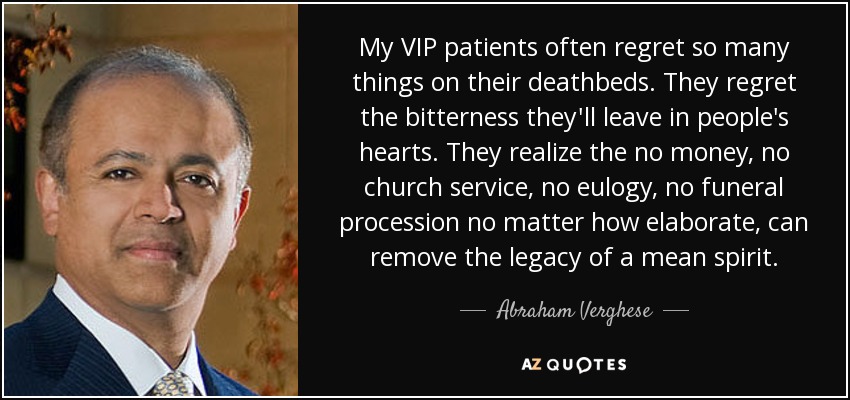 My VIP patients often regret so many things on their deathbeds. They regret the bitterness they'll leave in people's hearts. They realize the no money, no church service, no eulogy, no funeral procession no matter how elaborate, can remove the legacy of a mean spirit.
