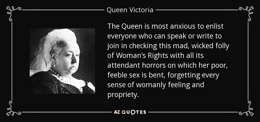 The Queen is most anxious to enlist everyone who can speak or write to join in checking this mad, wicked folly of Woman's Rights with all its attendant horrors on which her poor, feeble sex is bent, forgetting every sense of womanly feeling and propriety.