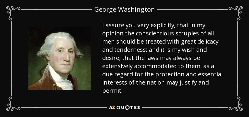 I assure you very explicitly, that in my opinion the conscientious scruples of all men should be treated with great delicacy and tenderness: and it is my wish and desire, that the laws may always be extensively accommodated to them, as a due regard for the protection and essential interests of the nation may justify and permit.