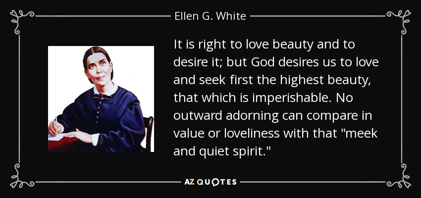 It is right to love beauty and to desire it; but God desires us to love and seek first the highest beauty, that which is imperishable. No outward adorning can compare in value or loveliness with that "meek and quiet spirit."