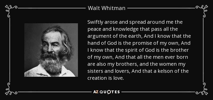 Swiftly arose and spread around me the peace and knowledge that pass all the argument of the earth, And I know that the hand of God is the promise of my own, And I know that the spirit of God is the brother of my own, And that all the men ever born are also my brothers, and the women my sisters and lovers, And that a kelson of the creation is love.