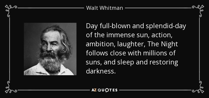 Day full-blown and splendid-day of the immense sun, action, ambition, laughter, The Night follows close with millions of suns, and sleep and restoring darkness.