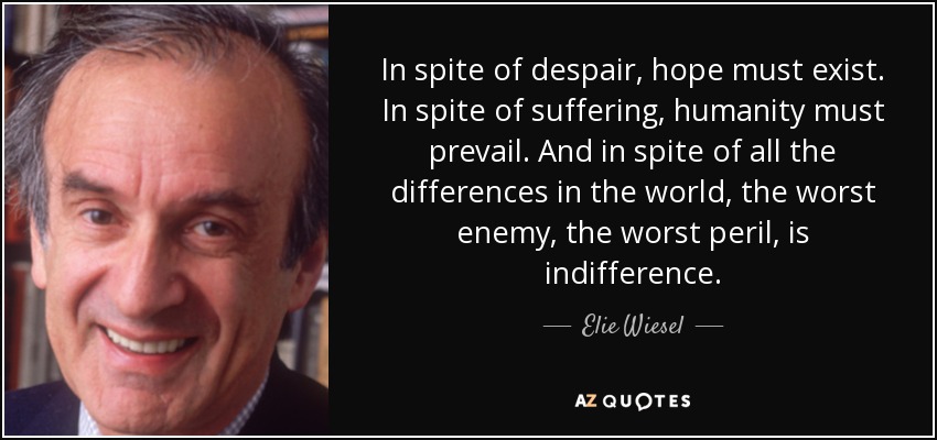 In spite of despair, hope must exist. In spite of suffering, humanity must prevail. And in spite of all the differences in the world, the worst enemy, the worst peril, is indifference.