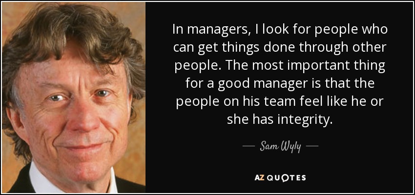 In managers, I look for people who can get things done through other people. The most important thing for a good manager is that the people on his team feel like he or she has integrity.