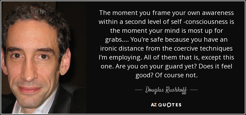 The moment you frame your own awareness within a second level of self -consciousness is the moment your mind is most up for grabs. ... You're safe because you have an ironic distance from the coercive techniques I'm employing. All of them that is, except this one. Are you on your guard yet? Does it feel good? Of course not.