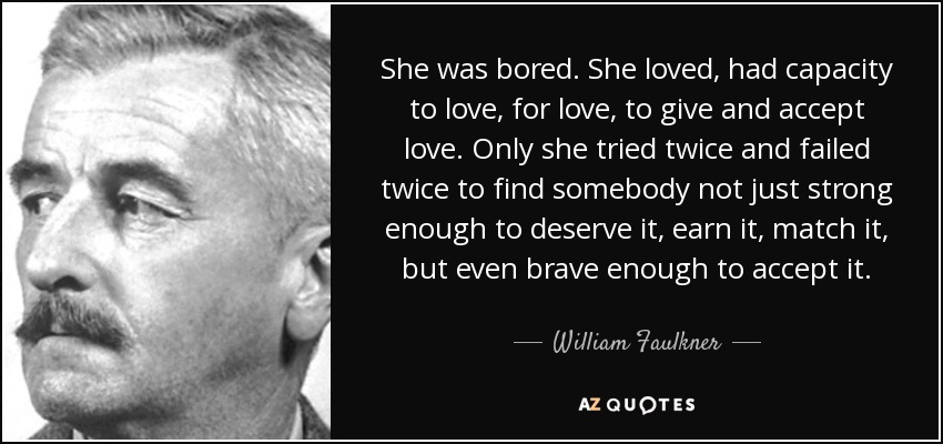She was bored. She loved, had capacity to love, for love, to give and accept love. Only she tried twice and failed twice to find somebody not just strong enough to deserve it, earn it, match it, but even brave enough to accept it.