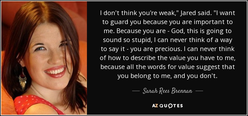I don't think you're weak," Jared said. "I want to guard you because you are important to me. Because you are - God, this is going to sound so stupid, I can never think of a way to say it - you are precious. I can never think of how to describe the value you have to me, because all the words for value suggest that you belong to me, and you don't.