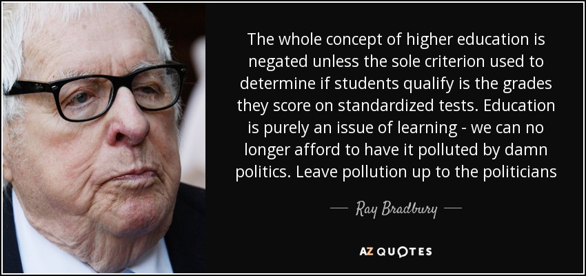 The whole concept of higher education is negated unless the sole criterion used to determine if students qualify is the grades they score on standardized tests. Education is purely an issue of learning - we can no longer afford to have it polluted by damn politics. Leave pollution up to the politicians