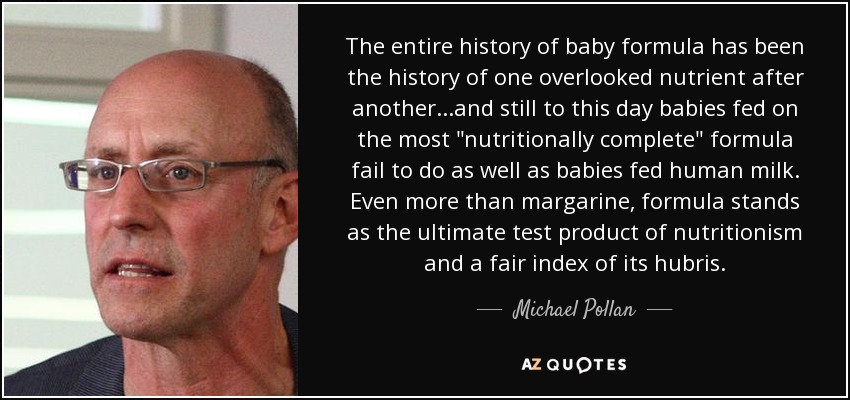 well as babies fed human milk. Even more than margarine, formula stands as the ultimate test product of nutritionism and a fair index of its hubris. -