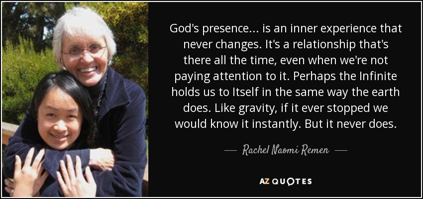God's presence. . . is an inner experience that never changes. It's a relationship that's there all the time, even when we're not paying attention to it. Perhaps the Infinite holds us to Itself in the same way the earth does. Like gravity, if it ever stopped we would know it instantly. But it never does.