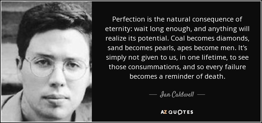 Perfection is the natural consequence of eternity: wait long enough, and anything will realize its potential. Coal becomes diamonds, sand becomes pearls, apes become men. It's simply not given to us, in one lifetime, to see those consummations, and so every failure becomes a reminder of death.