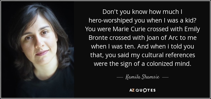 Don't you know how much I hero-worshiped you when I was a kid? You were Marie Curie crossed with Emily Bronte crossed with Joan of Arc to me when I was ten. And when i told you that, you said my cultural references were the sign of a colonized mind.