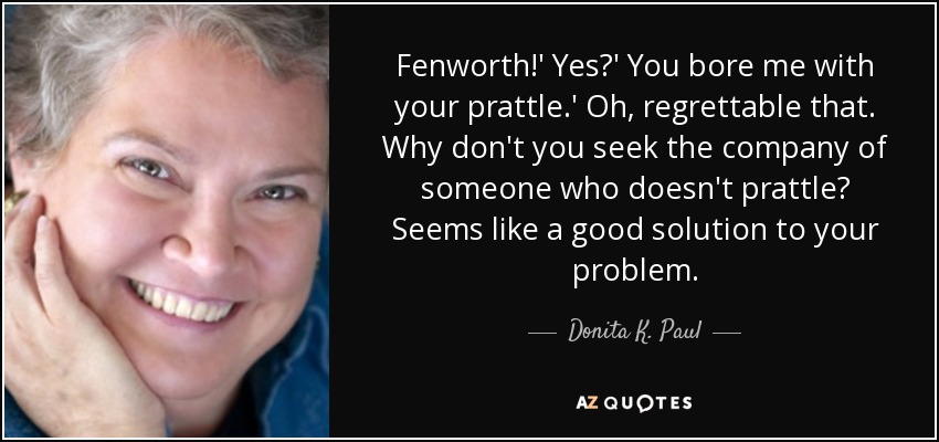 Fenworth!' Yes?' You bore me with your prattle.' Oh, regrettable that. Why don't you seek the company of someone who doesn't prattle? Seems like a good solution to your problem.