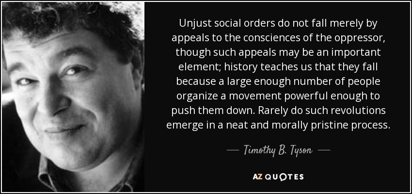 Unjust social orders do not fall merely by appeals to the consciences of the oppressor, though such appeals may be an important element; history teaches us that they fall because a large enough number of people organize a movement powerful enough to push them down. Rarely do such revolutions emerge in a neat and morally pristine process.