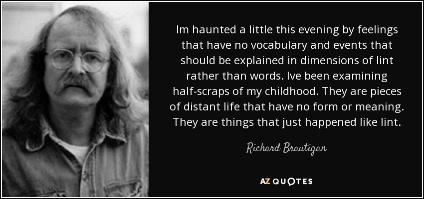 Im haunted a little this evening by feelings that have no vocabulary and events that should be explained in dimensions of lint rather than words. Ive been examining half-scraps of my childhood. They are pieces of distant life that have no form or meaning. They are things that just happened like lint.