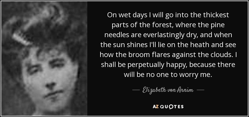 On wet days I will go into the thickest parts of the forest, where the pine needles are everlastingly dry, and when the sun shines I'll lie on the heath and see how the broom flares against the clouds. I shall be perpetually happy, because there will be no one to worry me.