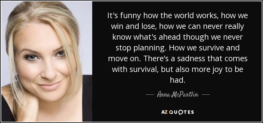 It's funny how the world works, how we win and lose, how we can never really know what's ahead though we never stop planning. How we survive and move on. There's a sadness that comes with survival, but also more joy to be had.