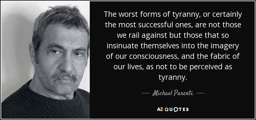 The worst forms of tyranny, or certainly the most successful ones, are not those we rail against but those that so insinuate themselves into the imagery of our consciousness, and the fabric of our lives, as not to be perceived as tyranny.