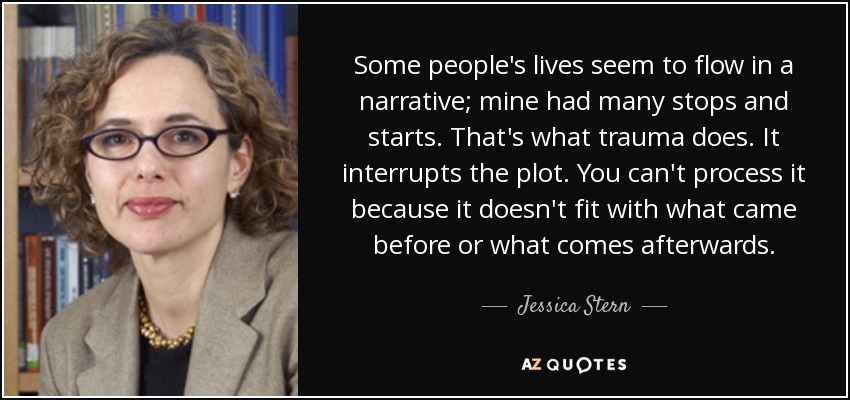 Some people's lives seem to flow in a narrative; mine had many stops and starts. That's what trauma does. It interrupts the plot. You can't process it because it doesn't fit with what came before or what comes afterwards.