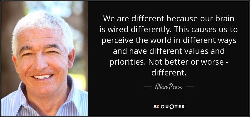 We are different because our brain is wired differently. This causes us to perceive the world in different ways and have different values and priorities. Not better or worse - different.
