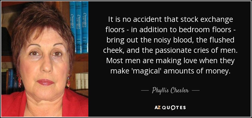 It is no accident that stock exchange floors - in addition to bedroom floors - bring out the noisy blood, the flushed cheek, and the passionate cries of men. Most men are making love when they make 'magical' amounts of money.