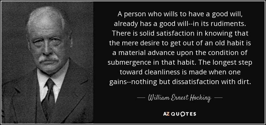 A person who wills to have a good will, already has a good will--in its rudiments. There is solid satisfaction in knowing that the mere desire to get out of an old habit is a material advance upon the condition of submergence in that habit. The longest step toward cleanliness is made when one gains--nothing but dissatisfaction with dirt.