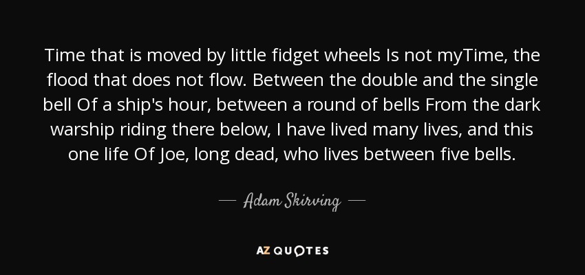 Time that is moved by little fidget wheels Is not myTime, the flood that does not flow. Between the double and the single bell Of a ship's hour, between a round of bells From the dark warship riding there below, I have lived many lives, and this one life Of Joe, long dead, who lives between five bells.