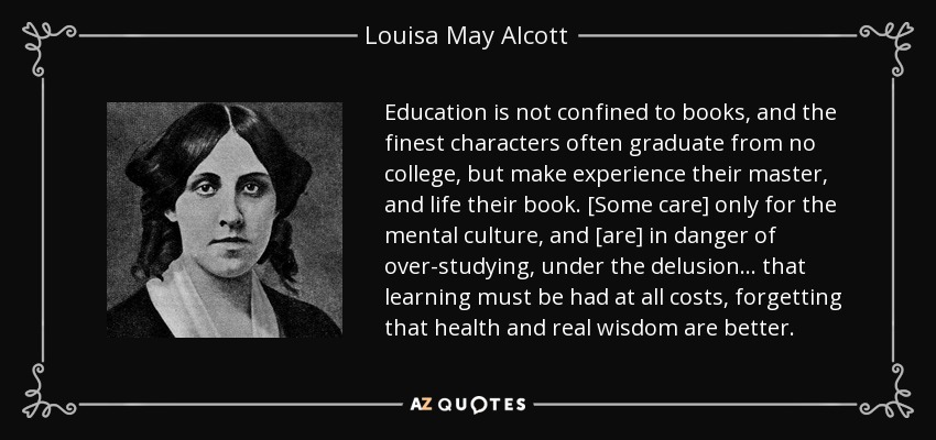 Education is not confined to books, and the finest characters often graduate from no college, but make experience their master, and life their book. [Some care] only for the mental culture, and [are] in danger of over-studying, under the delusion . . . that learning must be had at all costs, forgetting that health and real wisdom are better.