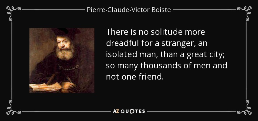 There is no solitude more dreadful for a stranger, an isolated man, than a great city; so many thousands of men and not one friend.