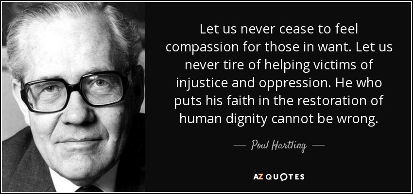 Let us never cease to feel compassion for those in want. Let us never tire of helping victims of injustice and oppression. He who puts his faith in the restoration of human dignity cannot be wrong.