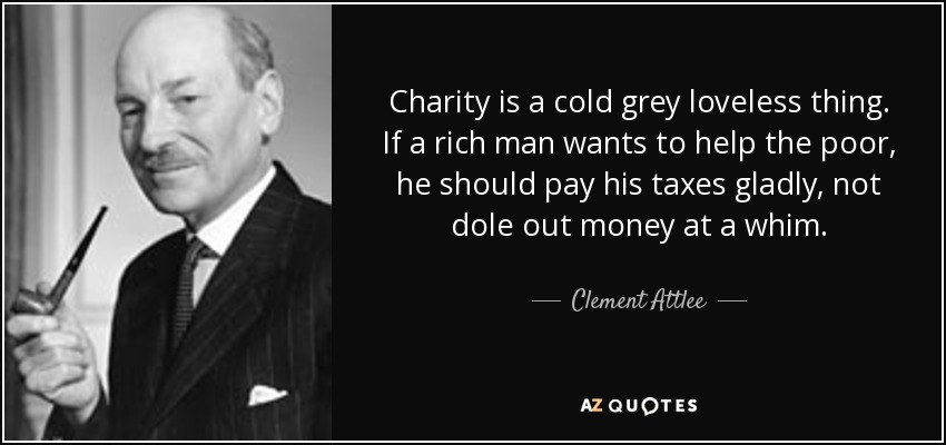 Charity is a cold grey loveless thing. If a rich man wants to help the poor, he should pay his taxes gladly, not dole out money at a whim.