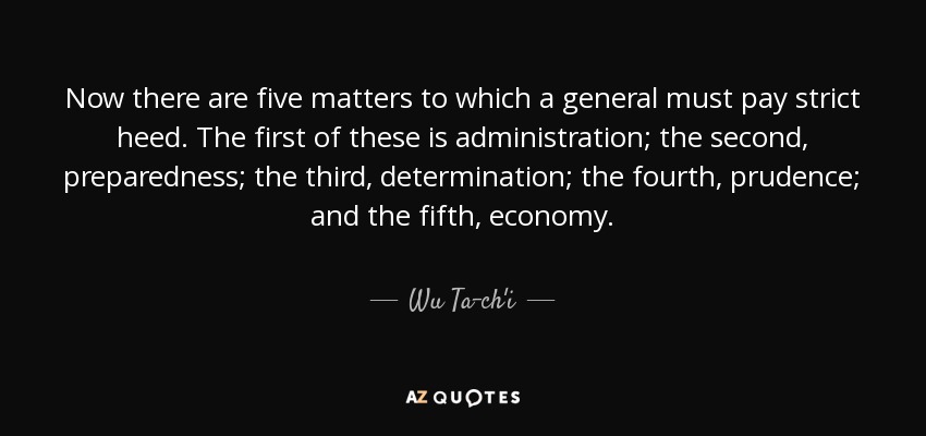 Now there are five matters to which a general must pay strict heed. The first of these is administration; the second, preparedness; the third, determination; the fourth, prudence; and the fifth, economy.
